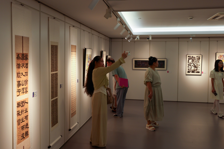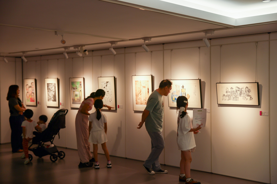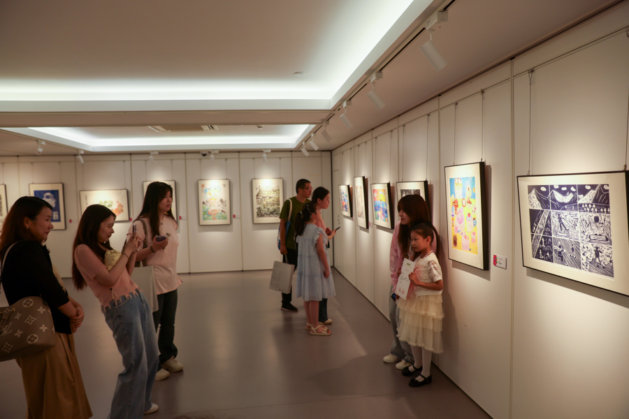 今年的少儿美术作品,在数量和质量上均有所提升。小学组徐名隽的作品《上海里弄里的色彩絮语》以黄墙、蓝门等鲜明色彩以及灵动线条,勾勒出上海里弄的独特景致。儿童组李艾宜的《龙腾龘龘》呈现了一条亮眼、能呼风唤雨的龙——世界是五彩的,龙也是多彩,她还为它的尾巴加上了烟花一样的花纹,这是一条活力满满的龙!中学组徐子涵的丝网版画《梦想派对》以蓝作为主色调,呈现出强烈的科技感。画面中,有人驻足眺望,有人乘飞行器穿梭,将对未来的畅想化作一场人与宇宙共生的热闹聚会,让“逐梦太空”的愿景变得具体而鲜活。