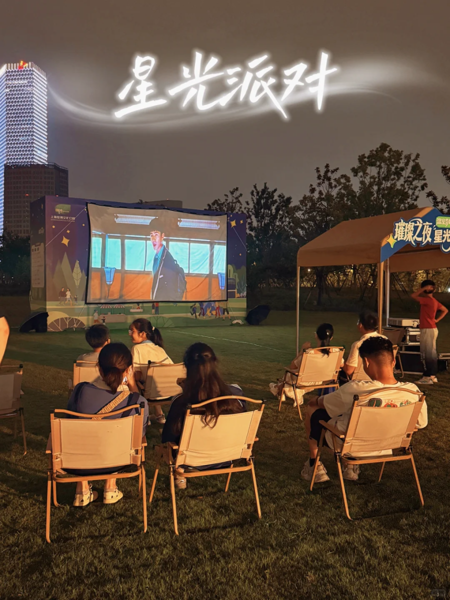 世博文化公园的星光草坪以“无边界观影”吸引着家庭客群。每周六、周日19:00起,这里会免费放映露天电影。观众可以自带露营垫,席地而坐,与朋友分享冰饮,一同沉浸在电影带来的欢乐氛围里。在音乐与光影交织的夜晚,人们用手机、手电筒照亮夜空,营造出一种独特的共鸣感。这种亲近自然、自由自在的观影方式,吸引了不少亲子家庭参与。